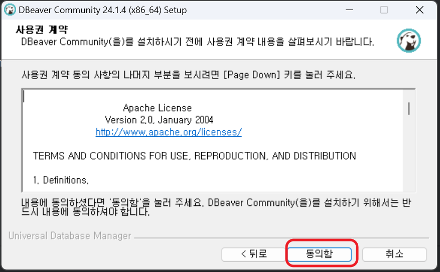 사용권 계약 동의 사항을 확인한 후 '동의함'을 클릭한다.