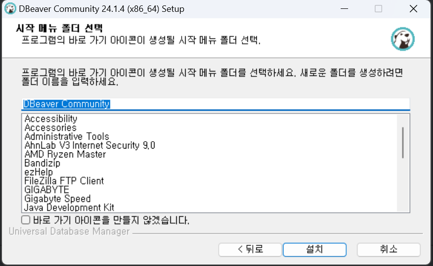 프로그램 바로 가기 아이콘이 생성될 시작 메뉴 폴더를 선택한다. '설치 시작'