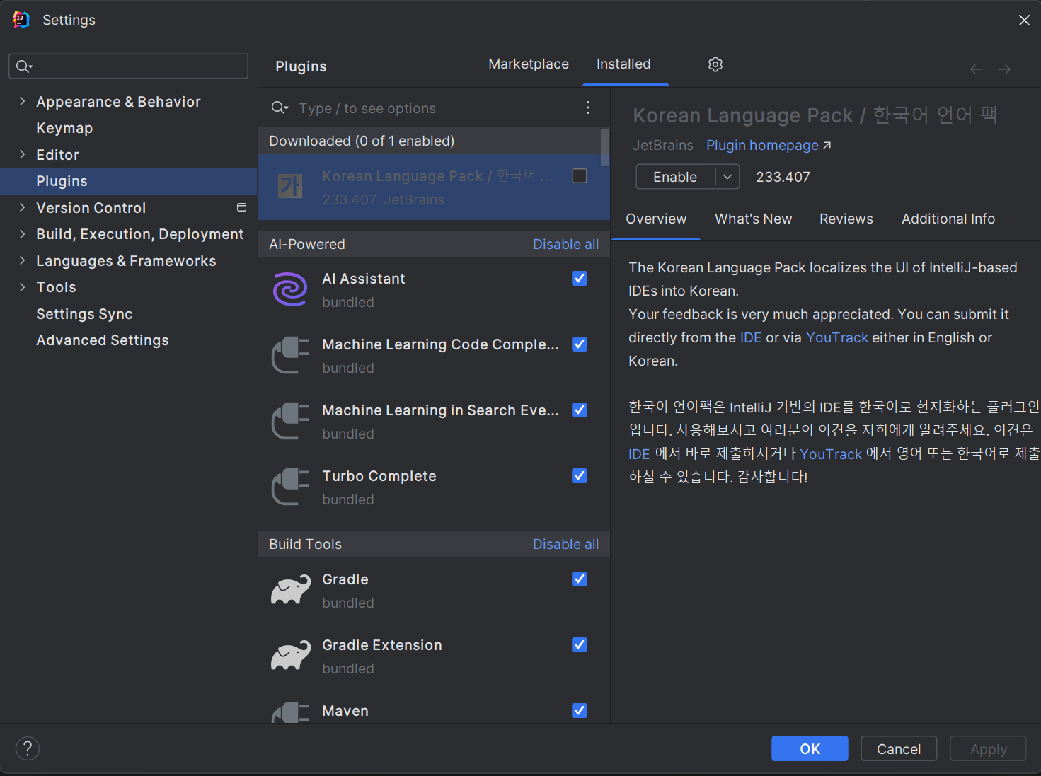 Korean Language Pack 플러그인이 설치되어 활성화돼있는 것이 보일 것이다.