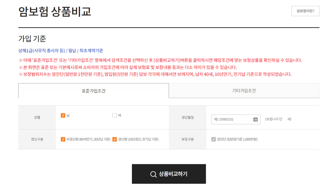가입을 원하는 종류의 보험을 검색한후 성별, 생년월일을 입력하면 여러 보험사들이 제시하는 보험들을 한눈에 볼 수 있다.