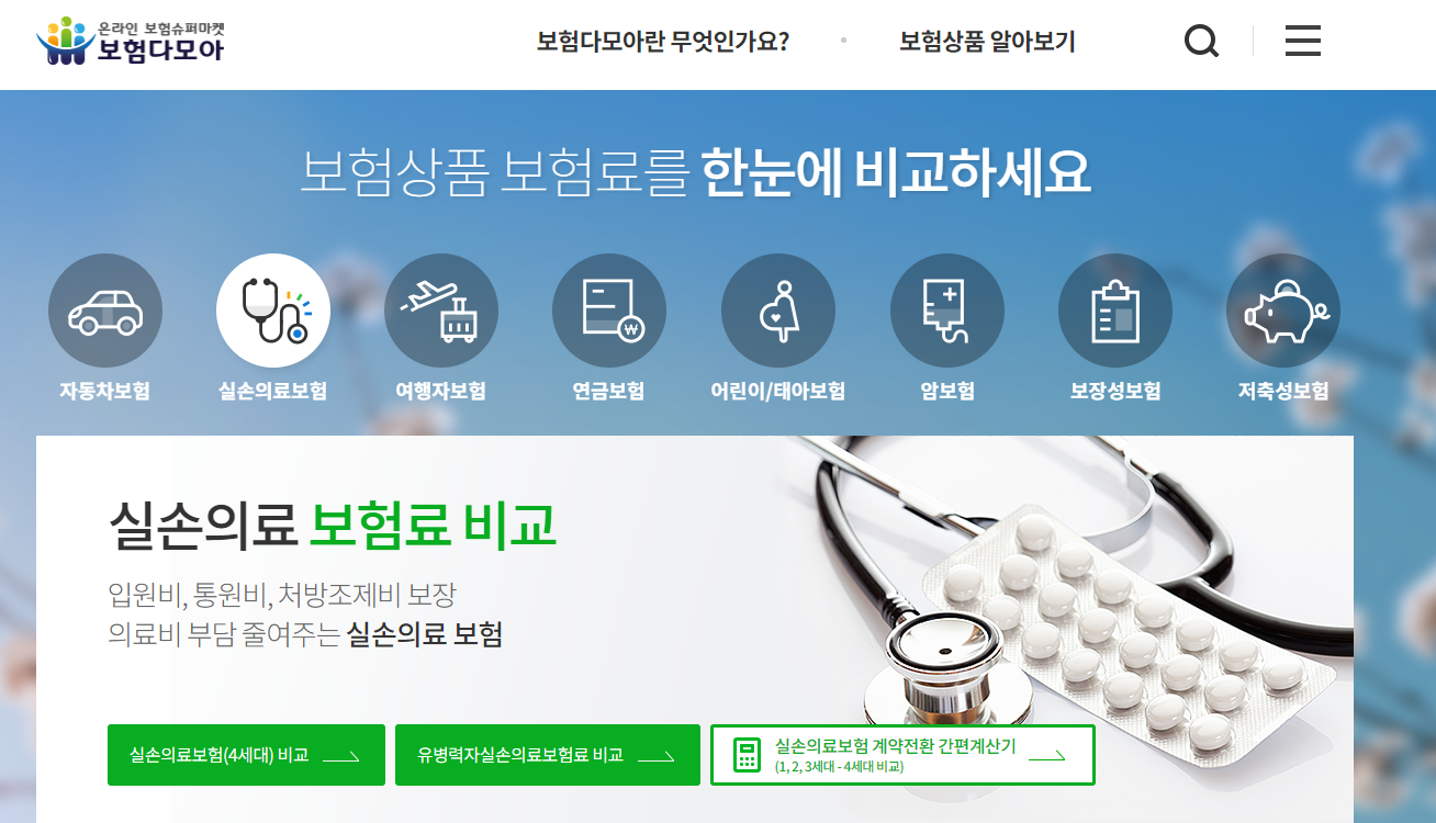 보험다모아 사이트는 자동차보험, 실손의료보험, 여행자 보험, 연금보험, 어린이/태아보험, 암보험, 보장성보험, 저축성 보험 등을 내 입맛에 맞게 검색하고 비교도 해볼 수 있는 사이트이다.